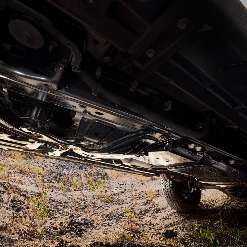 ใต้ท้องรถเสริมด้วยแผ่นเหล็กกล้าแรงดันสูงหนาเป็นพิเศษเพื่อเพิ่มการปกป้อง ขณะที่กันชนเหล็กแบบยึดกับโครงแชสซีส์ ถูกออกแบบมาเพื่อให้คุณฝ่าฟันเส้นทางทุรกันดารและมุมชันได้อย่างมั่นใจ